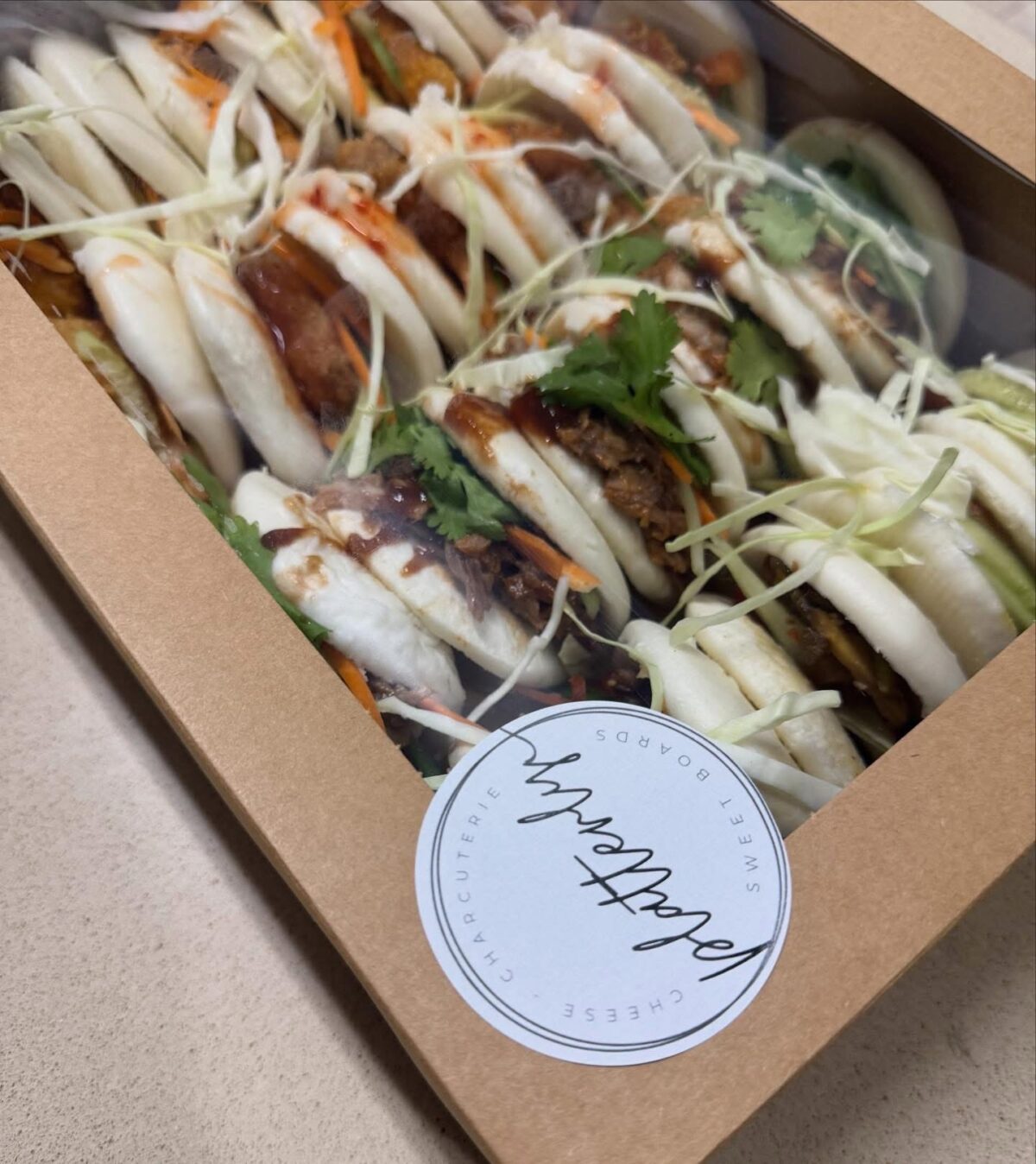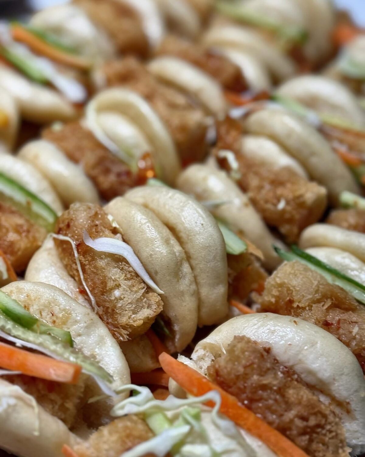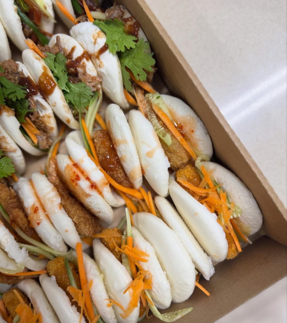 A selection of 20 soft, fluffy bao buns with four mouth-watering fillings: crispy honey-mustard chicken, golden breaded shrimp with sweet chili, glazed stir-fried vegetables, and slow-cooked pulled pork in BBQ sauce